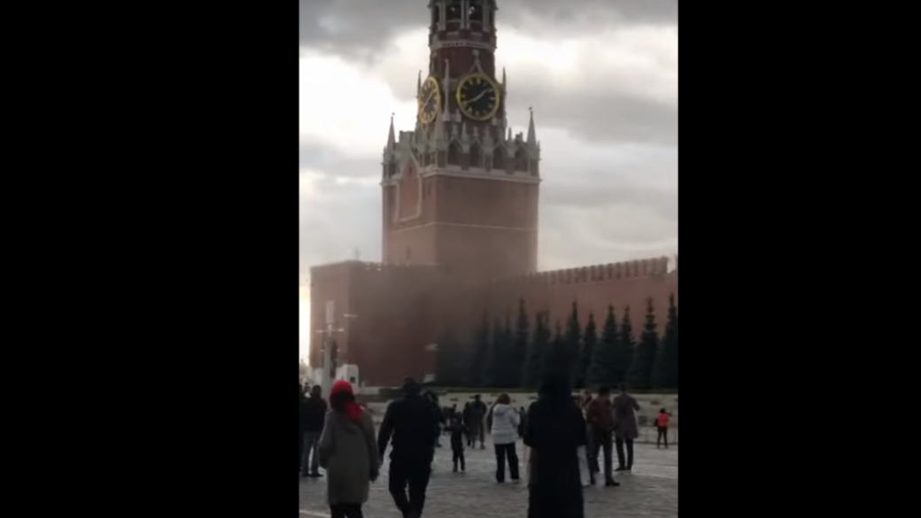В Москве ураганный ветер начал разрушать Кремль — сильный порыв ветра сорвал зубец с крепости и установленные для реставрации леса.