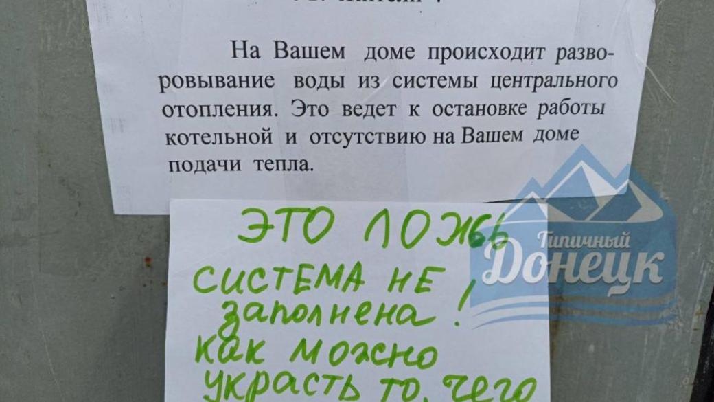 В оккупированном Донецке на подъездах стали появляться объявления, в которых дончан обвиняют в сливе воды из отопительной системы.