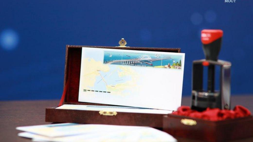 В Московский Гостиный Двор, где прошла торжественная церемония были доставлены штемпель и конверты, изготовленные дополнительно к выпуску почтовых марок. На марке изображена панорама транспортного перехода, соединяющего Керченский и Таманский полуостров.