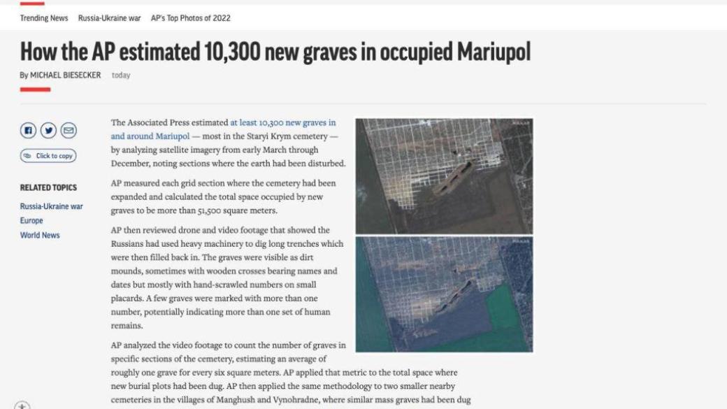 В агентстве отмечают, что в среднем на территории массовых захоронений расположена одна могила на каждые шесть квадратных метров. Журналисты также смогли проанализировать кладбища в селах Мангуш и Виноградное, где с марта были вырыты аналогичные братские могилы.