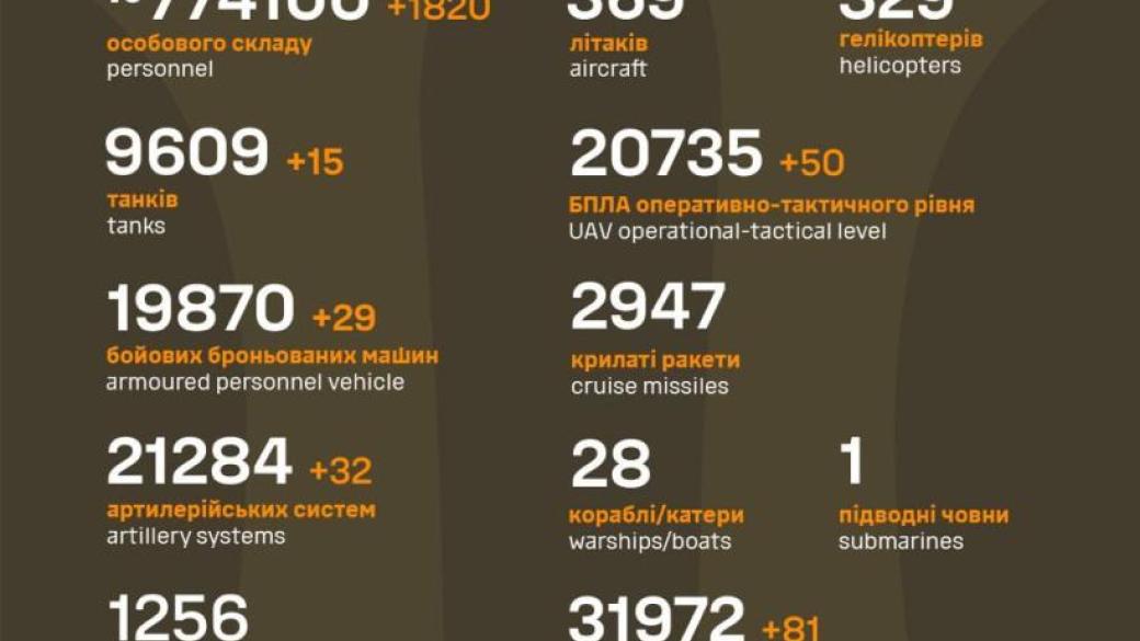 За прошедшие сутки Силы обороны ликвидировали 1820 оккупантов и уничтожили 210 единиц вражеской техники и вооружения.