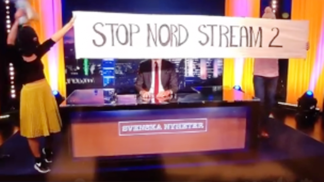 Он отметил, что активистов пригласили на шведское телевидение в качестве гостей в студии. Они, в свою очередь, воспользовались ситуацией и в самый разгар шоу заслонили ведущего огромным баннером «Stop Nord Stream 2!».