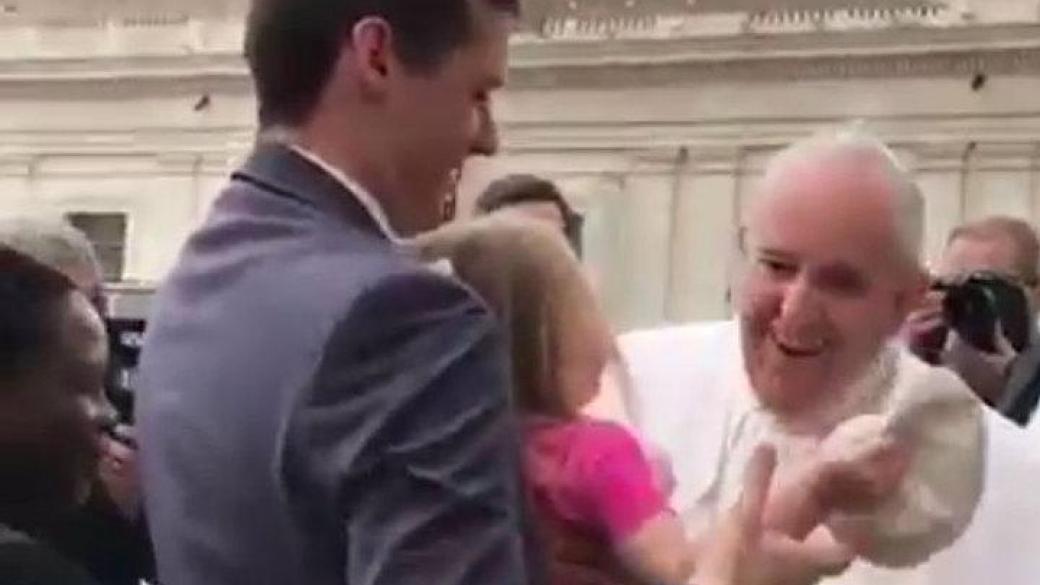 На видео запечатлено, что малышка отняла у понтифика шапочку, которую носят католические священники. Крестный принес ребенка Папе для благословения, во время этого таинства Ширли и сняла с Папы его шапку.