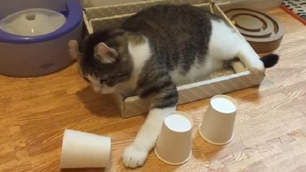 Животное обладает необычным даром — умный кот умеет угадывать, под каким стаканчиком спрятан шарик.
