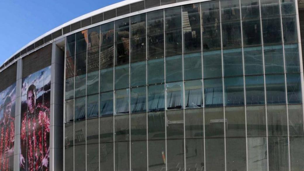 На фото видно, что в результате обстрела с фасада стадиона местами посыпались стекла и есть небольшие воронки на тротуарной плитке.
