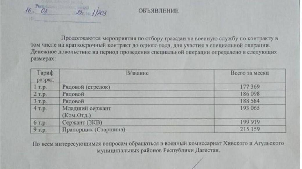 По данным ресурса, данный документ был обнародован в военкомате республике Дагестан. В документе озвучены следующие размеры выплаты: