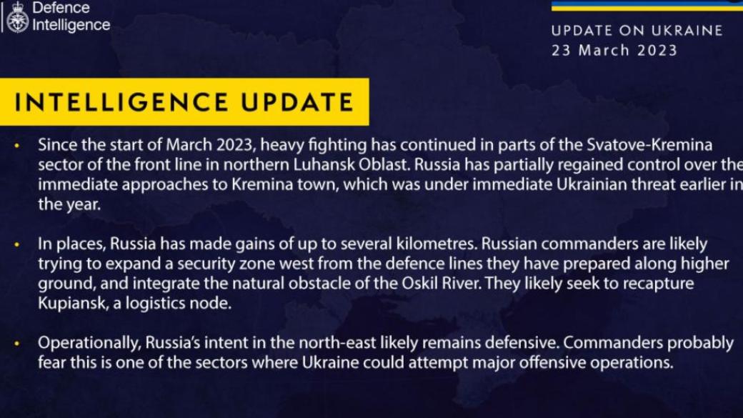 «Местами Россия добилась выигрыша до нескольких километров. Российское командование, вероятно, пытается расширить зону безопасности к западу от подготовленных ими оборонительных рубежей вдоль возвышенностей и интегрировать естественное препятствие в виде реки Оскол».