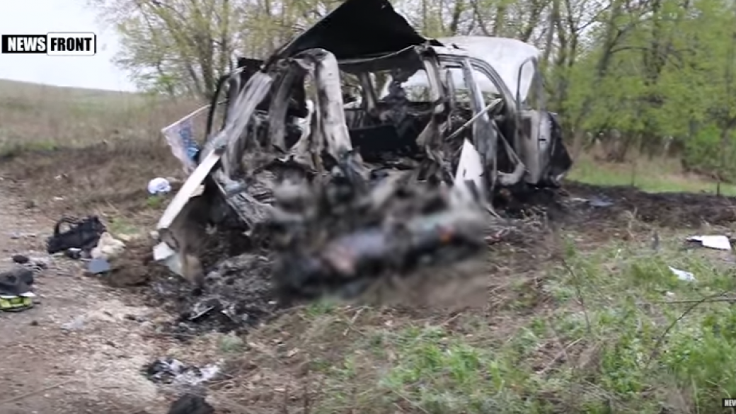 Боевики «ЛНР» опубликовали данное видео, на котором видно, что полностью сгоревший автомобиль находится на обочине грунтовой дороги.