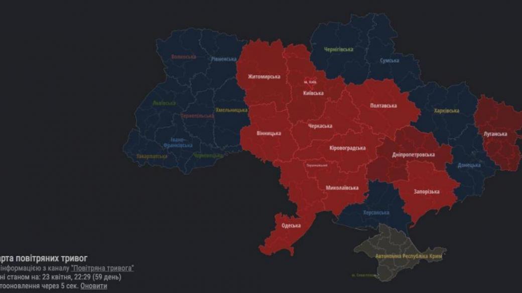 Киев, Киевская, Полтавская, Житомирская, Хмельницкая, Одесская, Николаевская, Кировоградская, Черкасская, Винницкая области — воздушная тревога.