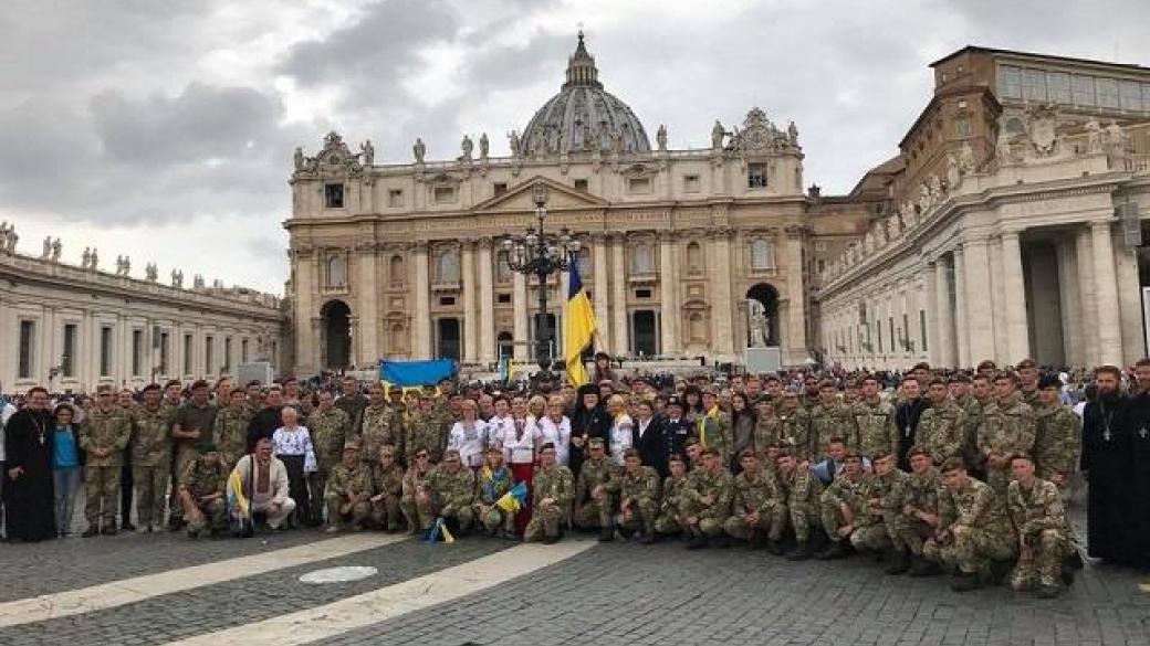 «23 мая военнослужащие Вооруженных Сил Украины, Национальной гвардии Украины, Государственной пограничной службы Украины, раненые воины АТО, женщины, потерявшие мужей на войне, курсанты и оркестр Национальной академии сухопутных войск имени П. Сагайдачного приняли участие в общей аудиенции Папы Римского Франциска на площади Святого Петра в Ватикане. Делегацию возглавлял владыка Михаил Колтун, руководитель Департамента военного капелланства УГКЦ. Приветствуя украинских воинов, понтифик отметил, что он неустанно молит Господа, чтобы он залечил раны, нанесенные войной и одарил своим миром дорогую украинскую землю», — говорится в сообщении.