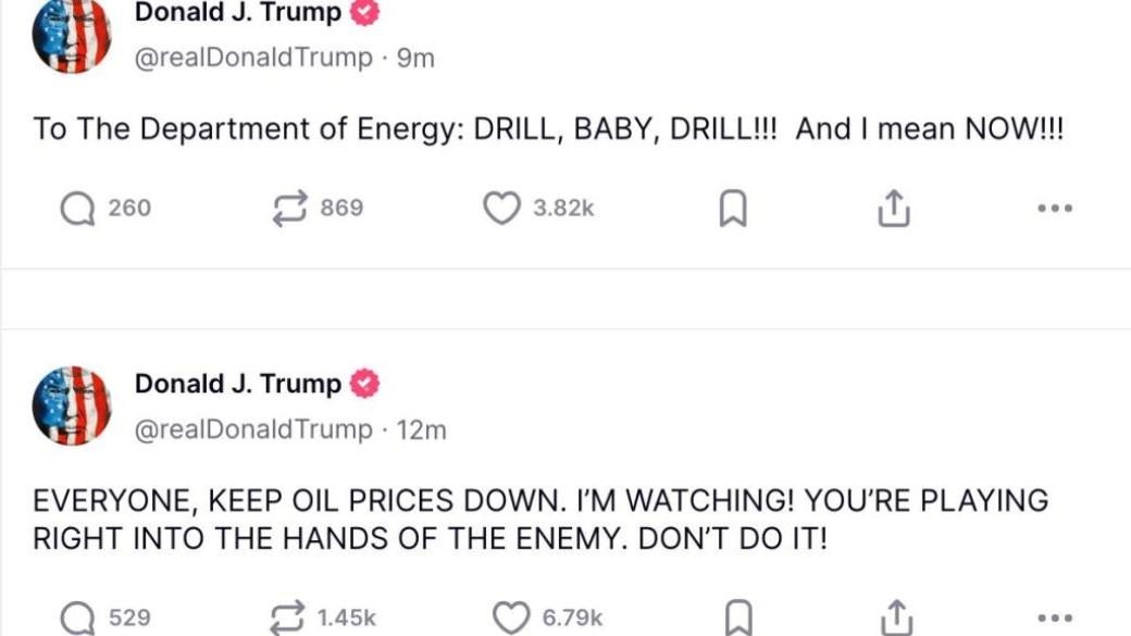 Президент США Дональд Трамп призвал "всех" не допускать роста цен на нефть и заявил, что "внимательно следит" за этим. Об этом американский лидер написал в Truth Social.