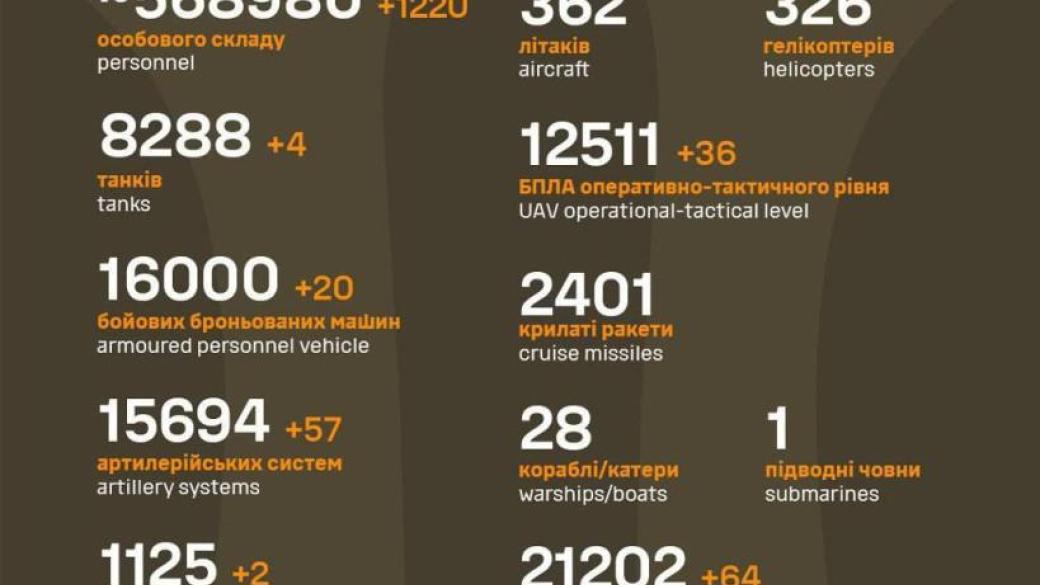 Силы обороны за последние сутки ликвидировали 1220 оккупантов и более 150 единиц вражеской техники.