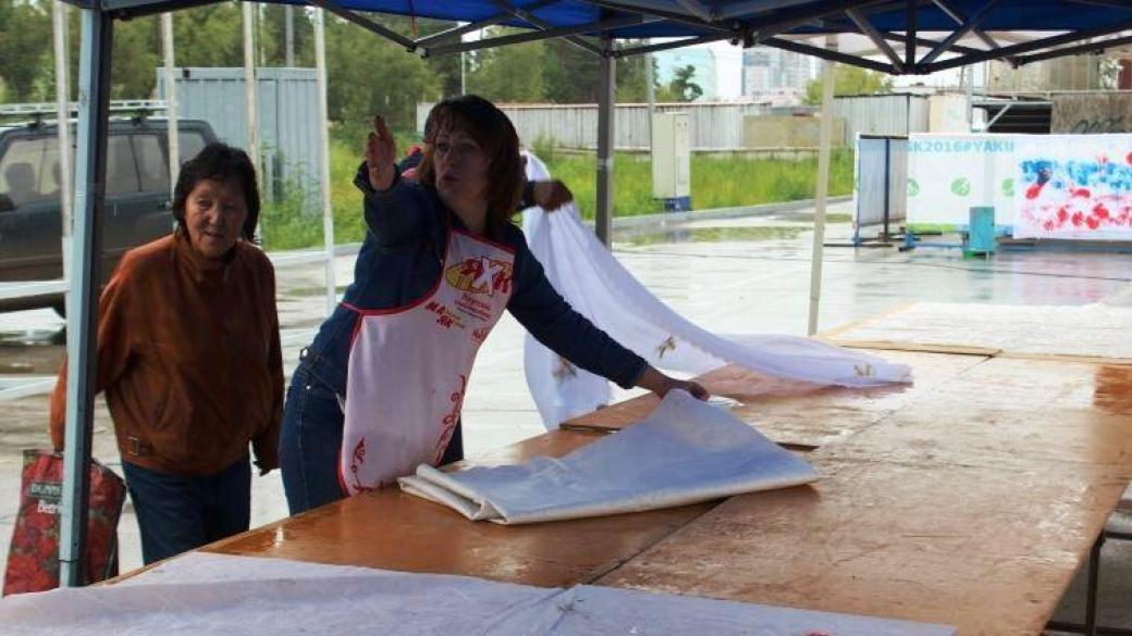 На митинге, посвященном Дню российского флага, прошедшем вчера в Якутске участники мероприятия за считанные секунды расхватали праздничное угощение в виде огромного торта весом в 280 килограммов, который был испечен местными кондитерами для детей-сирот.