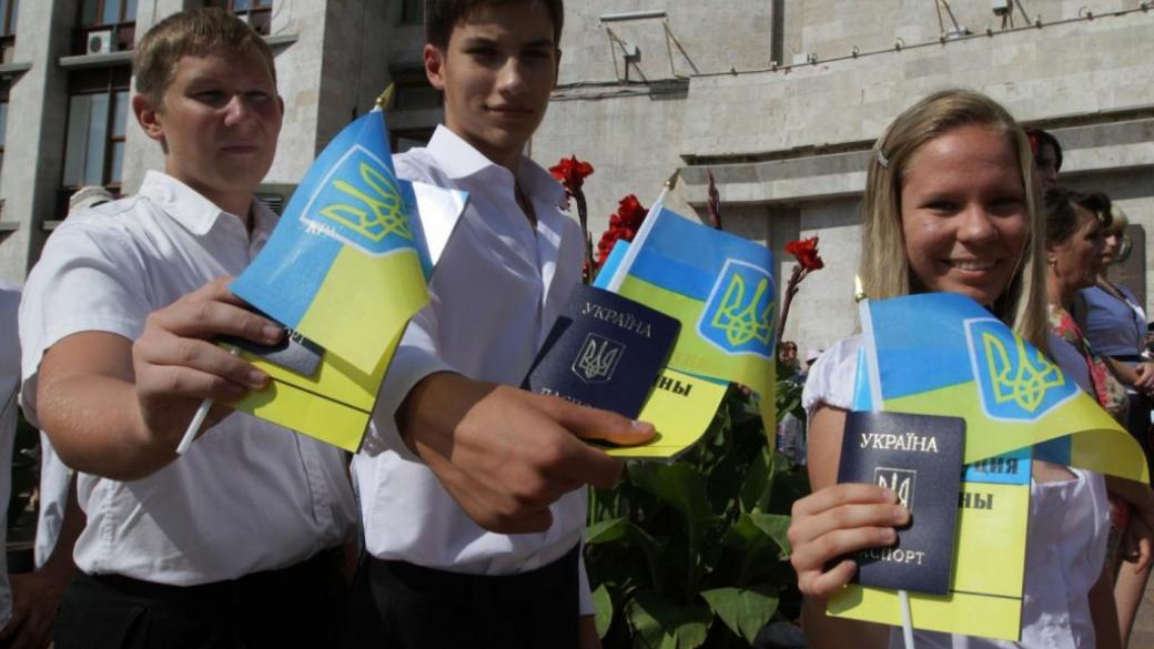 На фото показана еще не захваченная Донецкая облгосадминистрация, памятник Шевченко, местные подростки с украинскими паспортами и флагами.