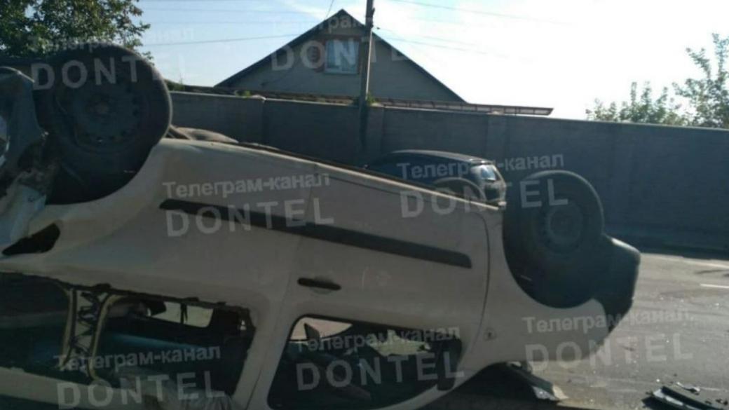 По словам очевидцев, сотрудник «МВД ДНР» на автомобиле «Фольксваген» врезался на большой скорости в белое «Рено», когда автомобиль поворачивал, то есть ехал на небольшой скорости.
