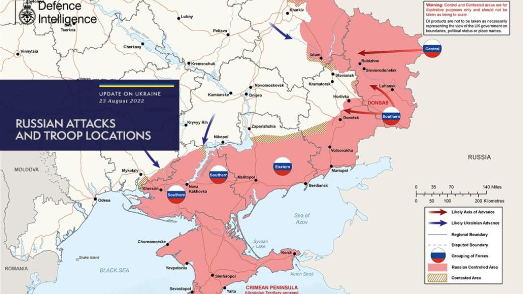 Войска РФ продолжают полномасштабное наступление на украинские города, пытаясь прорвать оборону на востоке страны, а также предпринимают попытки контратак на юге. Об этом сообщает Министерство обороны Британии, публикуя актуальную карту боевых действий в Украине по состоянию на 23 августа.