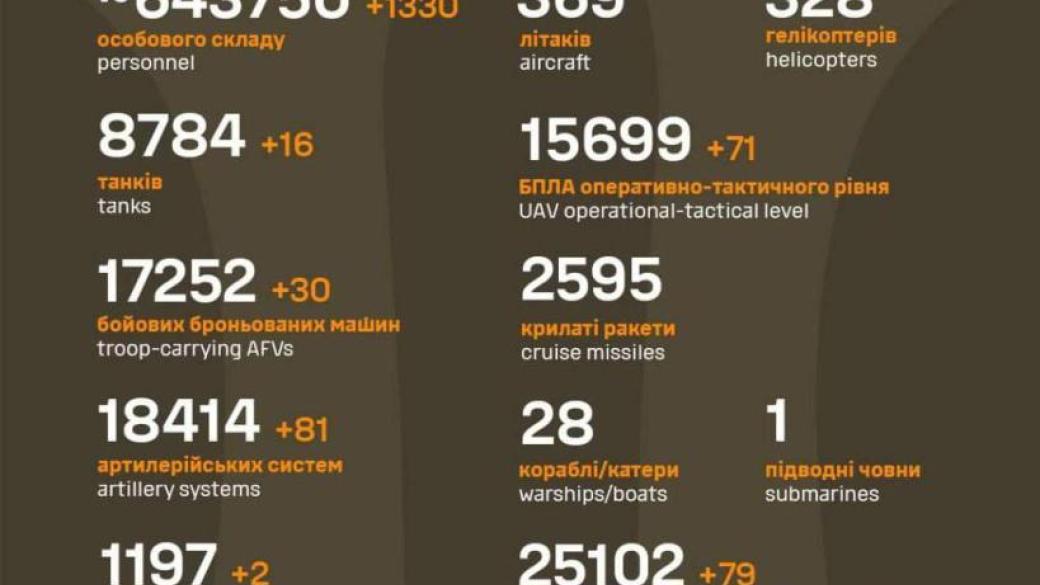 Общие потери россии с начала полномасштабной войны против Украины составили: