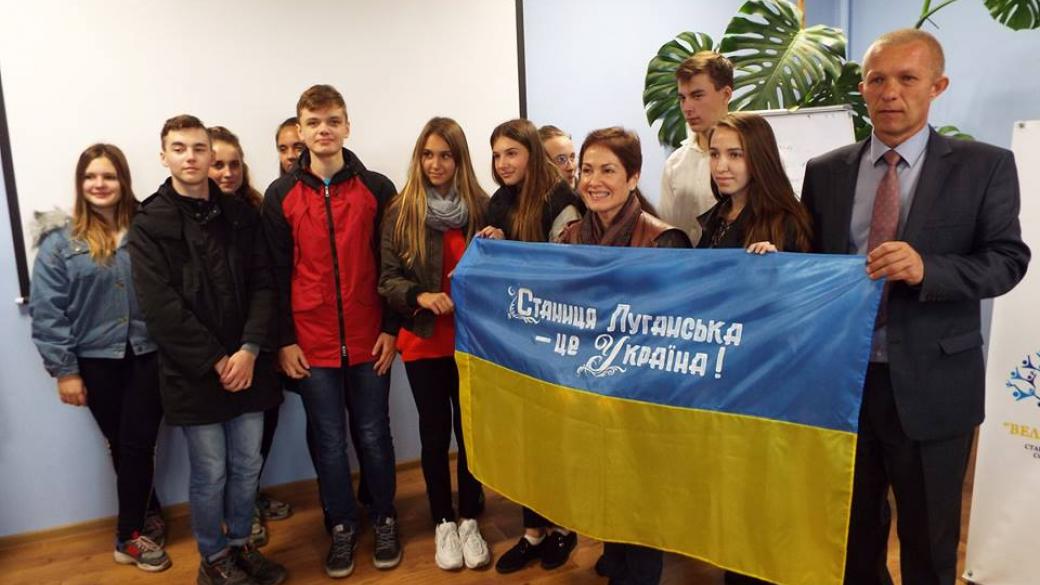 В качестве ответного подарка Мари Йованович получила флаг Украины с надписью «Станица Луганская — это Украина».