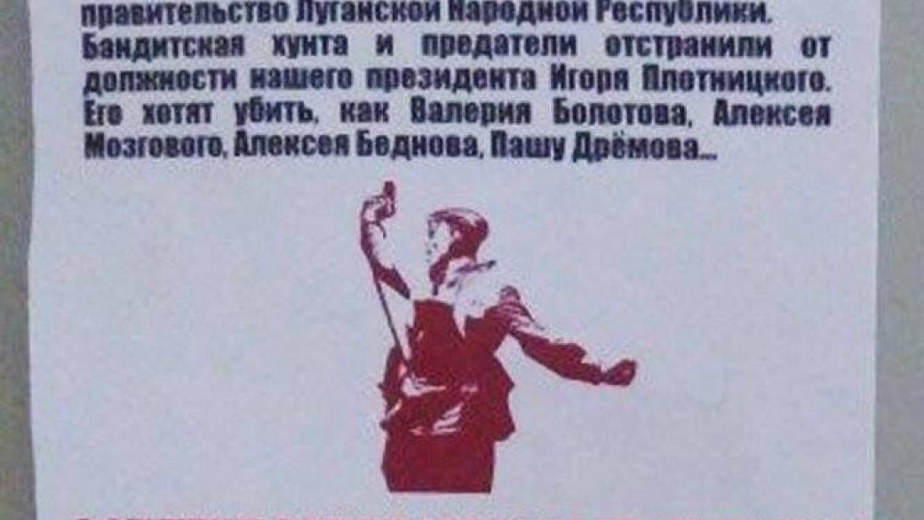 В листовках говорится о том, что боевики преступным образом захватили власть на Луганщине, свергнув «законно избранного главу» Игоря Плотницкого. При этом уточняется, что Плотницкого «хотят убить, как Валерия Болотова, Алексея Мозгового, и остальных».
