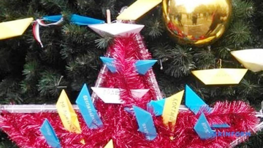 Местные активисты приносили к елке желтые и синие кораблики. На некоторых из них были написаны имена пленных украинских военных моряков.
