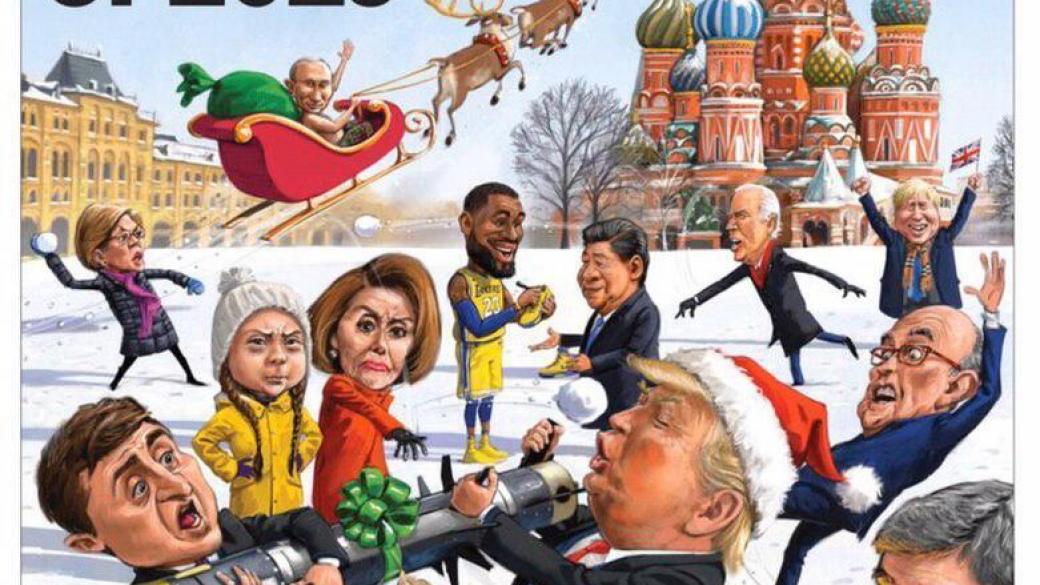 Авторы изобразили политиков на фоне Кремля. Президент России Путин изображен в карете Санта Клауса с мешком подарков, а Трамп и Зеленский не могут поделить между собой крылатую ракету. Рядом с ними генпрокурор США Уильям Барр поджигающий доклад спецпрокурора Мюллера, а радостный Борис Джонсон, размахивает британским флажком.
