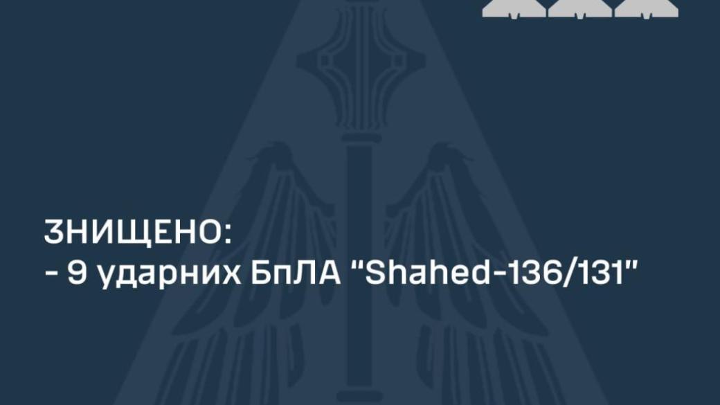 Все девять «шахедов» уничтожены силами и средствами Воздушных сил и Сил обороны Украины в пределах Одесской и Хмельницкой областей, сообщает командование ВС ВСУ.