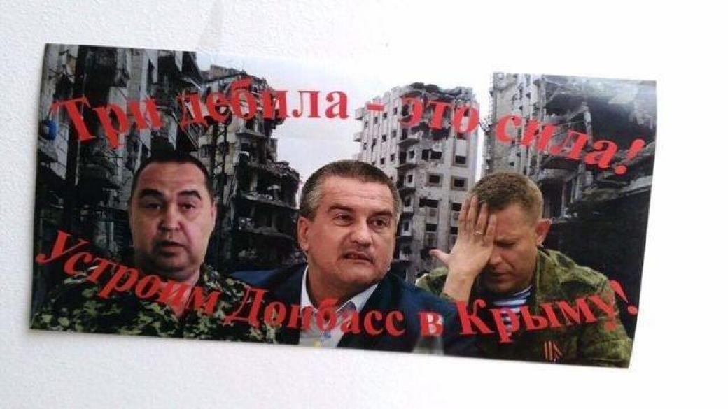 В оккупированных Коктебеле и Феодосии неизвестные расклеяли листовки с изображением «главы» аннексированного Крыма Сергея Аксенова в ообществе главарей «ЛДНР» Александра Захарченко и Игоря Плотницкого.