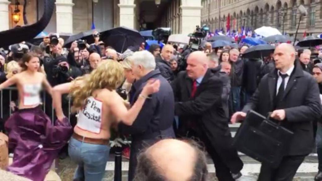Во Франции активистка движения Femen ворвалась на пресс-конференции кандидата в президенты Марин Ле Пен и устроила акцию.