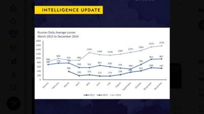"За два года конфликта российские потери совпадают, а во многих случаях и превосходят те, что составляли ее первоначальную силу. Подтвержденные потери России включают более 2700 танков и 5000 БМП и БТР. Число убитых и раненых в России, вероятно, составляет около 350 тысяч ".