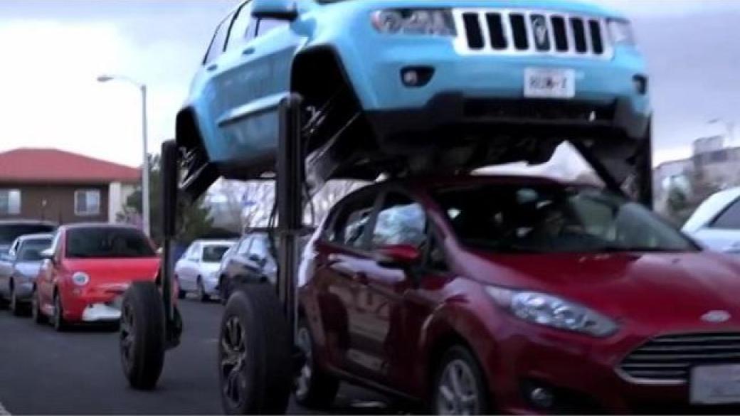 Новая машина оборудована гидравлической системой, поднимающей каркас автомобиля на несколько метров, и машина с легкостью проедет над другими авто, стоящими в пробке.