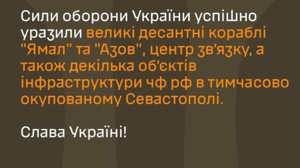 По сообщению военного ведомства Украины, поражены несколько объектов инфраструктуры Черноморского флота, центр связи, а также крупные десантные корабли «Ямал» и «Азов».