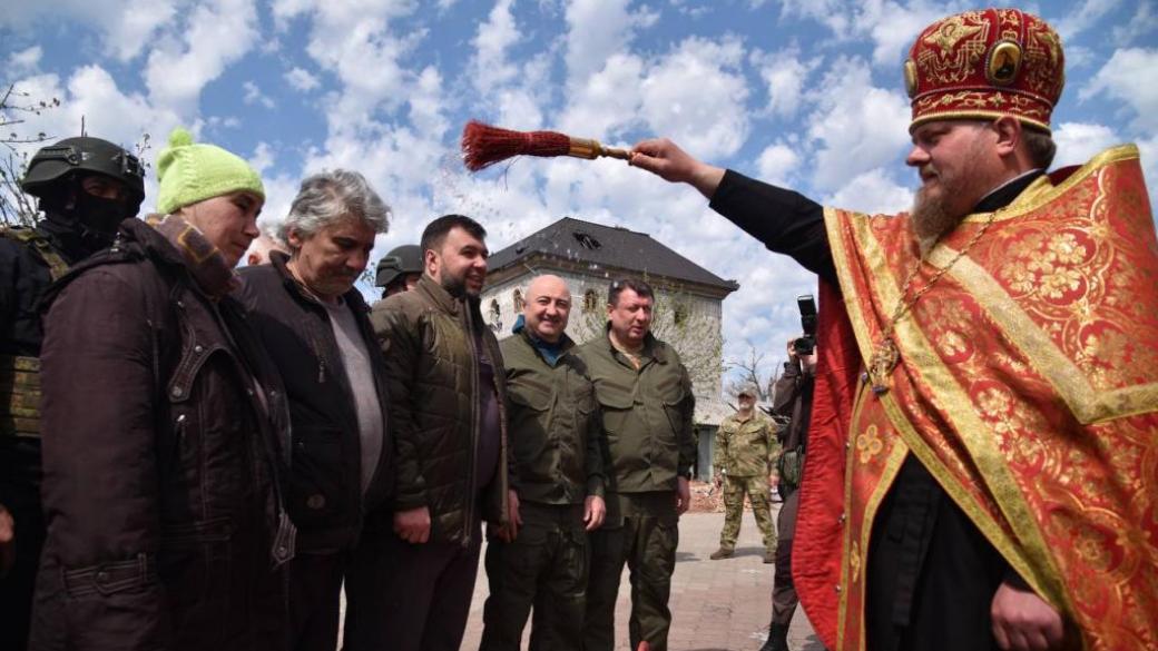 Главарь «ДНР» Денис Пушилин отпраздновал Пасху в мариупольском храме Архистратига Божия Михаила. Об этом сообщают телеграм-каналы ОРДО.