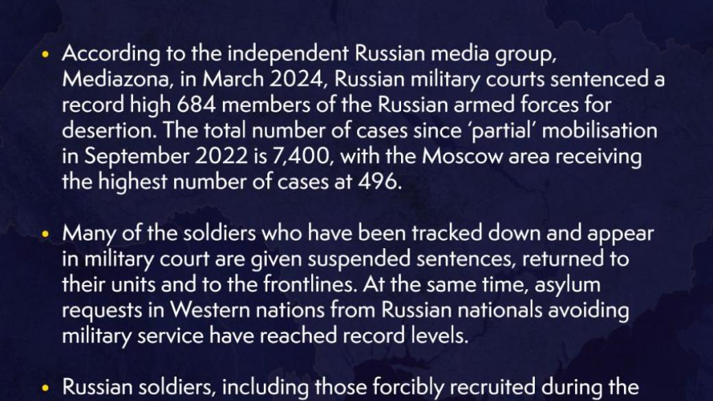 По информации британской разведки, по данным независимой российской медиагруппы "Медиазона", в марте 2024 года российские военные суды за дезертирство приговорили рекордное число 684 военнослужащих рф. При этом с сентября 2022 года общее количество случаев с момента "частичной" мобилизации составляет 7400, а в Московской области зарегистрировано наибольшее количество случаев - 496.