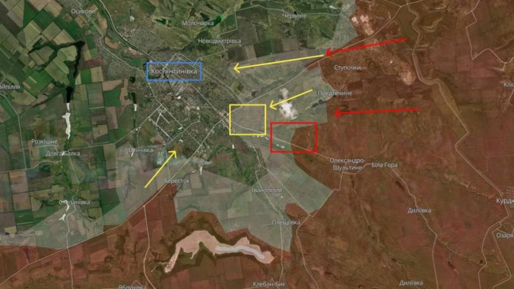 Аналитики отмечают, что дополнительным направлением давления россиян являются юго-западные окраины Константиновки в районе населенных пунктов Бересток и Ильиновка.
