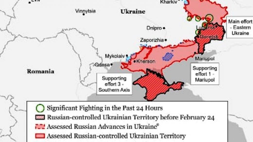 По данным аналитиков ISW, российские войска активизировали наступление в районе Лимана и Авдеевки и преуспели в этом 23 мая. На данный момент в Лимане проходят бои и российские войска пытаются перерезать украинские линии поставки. Российские войска также дополнительно усилили артиллерийские удары по Авдеевке.