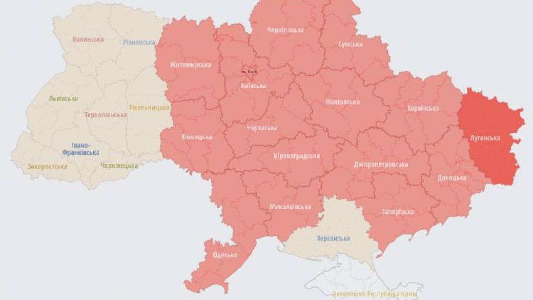 В Украине почти по всем регионам объявлена воздушная тревога. Карта тревог не затрагивает только Запад Украины, а также Херсонскую область и украинский Крым (см. фото).