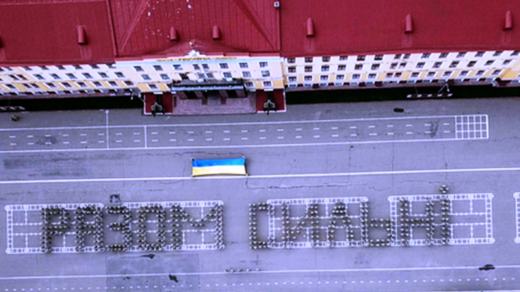 Пресс-служба Министерства обороны Украины сообщает, что десятки курсантов Национальной академии сухопутных войск имени гетмана Петра Сагайдачного, расположенной во Львове, выстроились в большие буквы «Разом сильні».