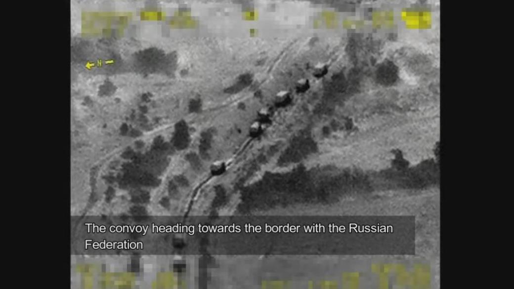 Исследовательская лаборатория DFRLab изучила кадры видео. Специалисты отметили на карте примерный маршрут автоколонны и некоторые участки местности и объекты, попавшие на видео.