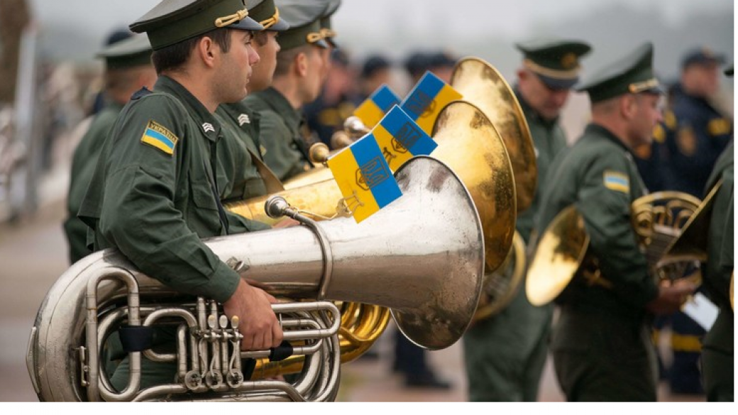 Государственный гимн Украины после торжественного поднятия флага. исполнили военнослужащие с музыкальным сопровождением в исполнении военных духовых и симфонического оркестров.