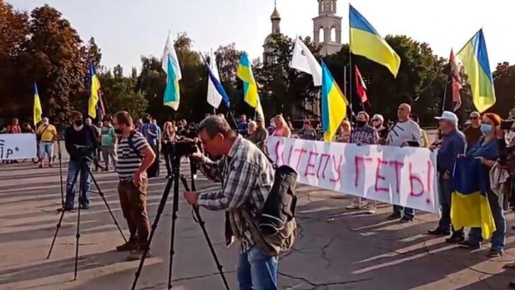 В руках митингующие держали плакаты с надписями «Штепа = русской мир» и скандировали «Штепу прочь!», «Штепу на нары», «Славянск — это Украина!».