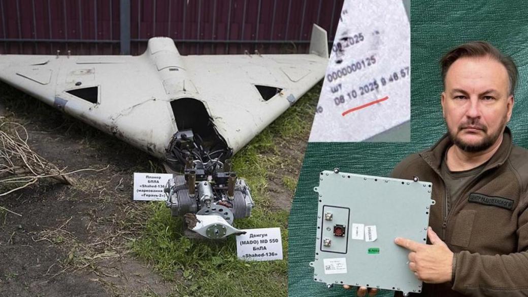 Он продемонстрировал китайскую антенну спутниковой навигации с "Шахеда", которая была установлена на этот БПЛА 8 октября, а уже 15 октября он был сбит в Украине.