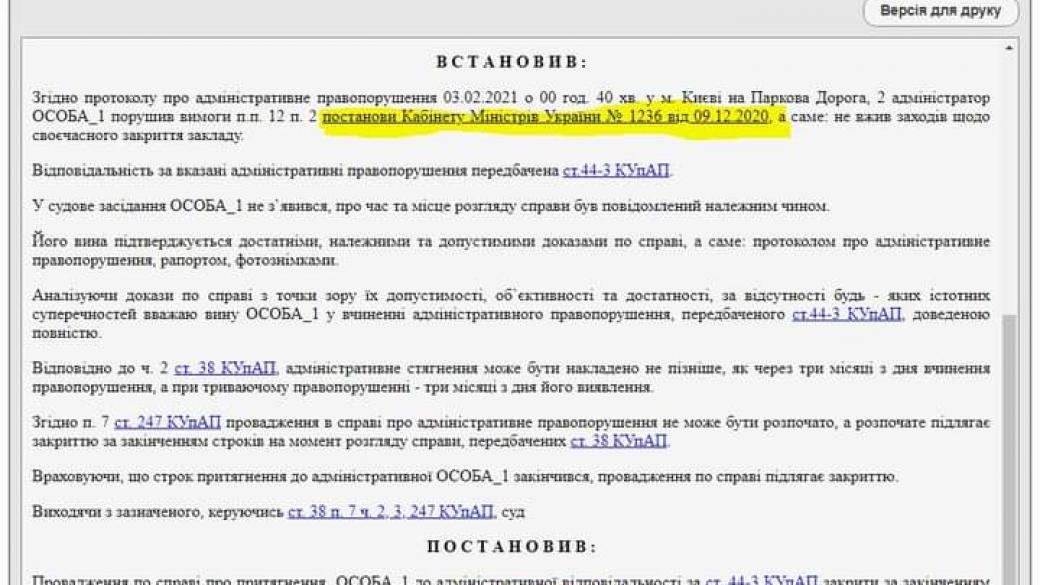 Согласно материалам дела в феврале администратор одного из заведений Киева не закрыл его вовремя, из-за чего правоохранители и составили протокол.