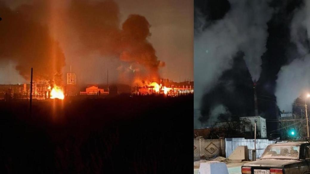 В городе Ефремов Тульской области поражены мощности "Ефремовского завода синтетического каучука", который специализируется на производстве составных частей пластических взрывчатых веществ и твердого ракетного топлива. Зафиксированы взрывы и масштабный пожар на территории производства.