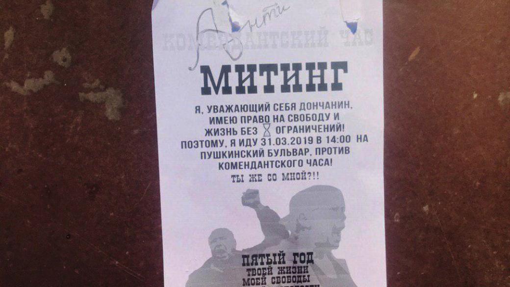 В неподконтрольном Донецке появились листовки с призывом выйти на митинг против комендантского часа. Такой информацией сегодня, 25 марта, поделился в Twitter очевидец.