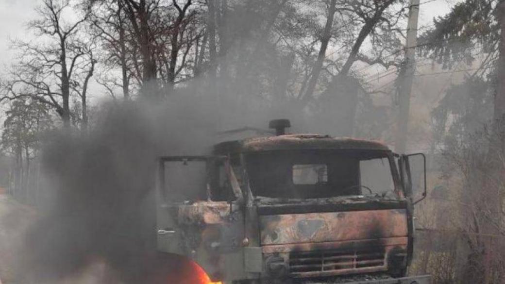 Под Киевом обычные граждане сожгли КамАЗ оккупантов с помощью коктейля Молотова.