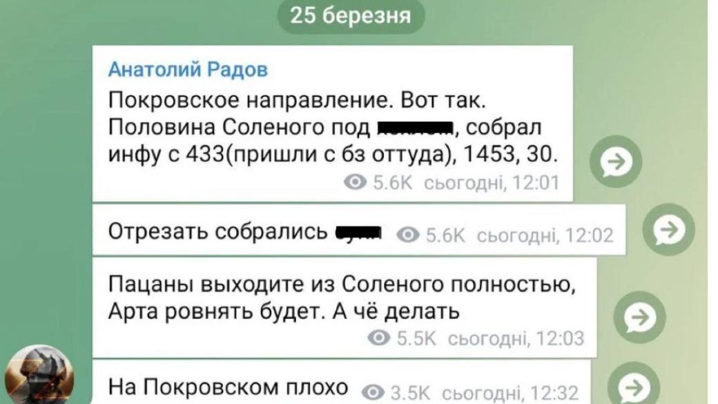 "На Покровском плохо. Пацаны выходите из Соленого полностью, Арта ровнять будет. А чё делать".