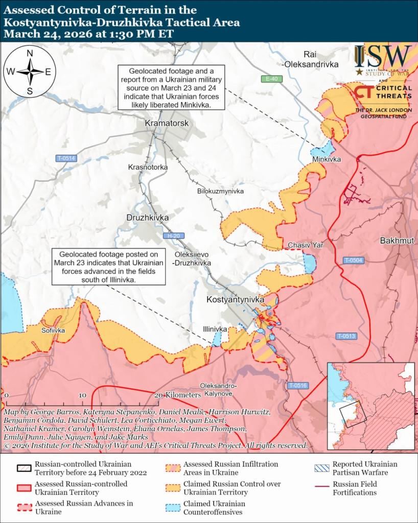 Также зафиксировано продвижение на Константиновском направлении: к югу от города Константиновка и н.п. Ильиновка.