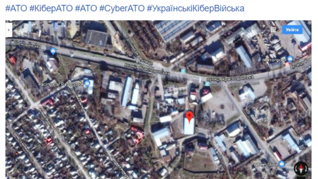 Украинский хакер Евгений Докукин отметил: «Украинские кибервойска определили географические координаты базы российских оккупантов. Военная база российских оккупантов находится в Луганске. В этом ангаре много военной техники. Все географические данные о террористах я выслал в СБУ и волонтерам, работающим с армией. Чтобы наши войска могли обезвредить их на Донбассе».
