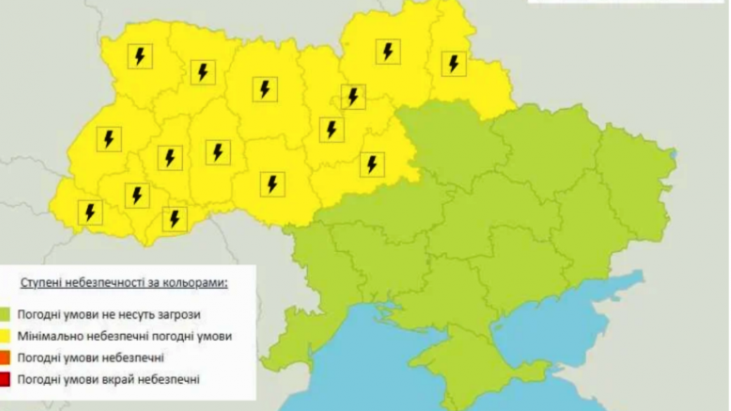 «До конца суток 25 апреля и ночью 26 апреля в западных, северных, Винницкой и Черкасской областях, грозы. Из-за непогоды объявлен I уровень опасности, желтый».