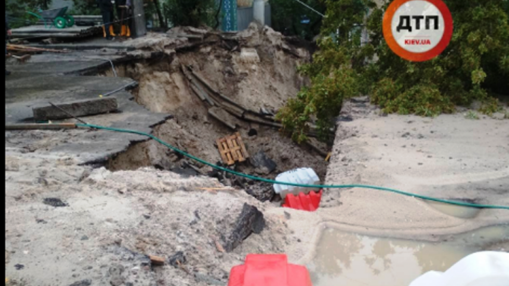 В Киеве из-за мощного ливня частично обвалился путепровод на пересечении улиц Кирилловской и Телиги.